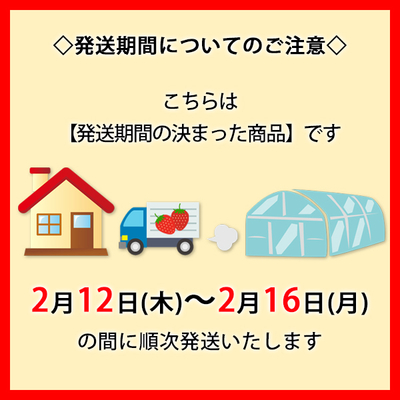 | 発送目安 | 2月12日(木)~2月16日(月)の間に発送 ※いちごの生育状況により前後する場合がございます |
